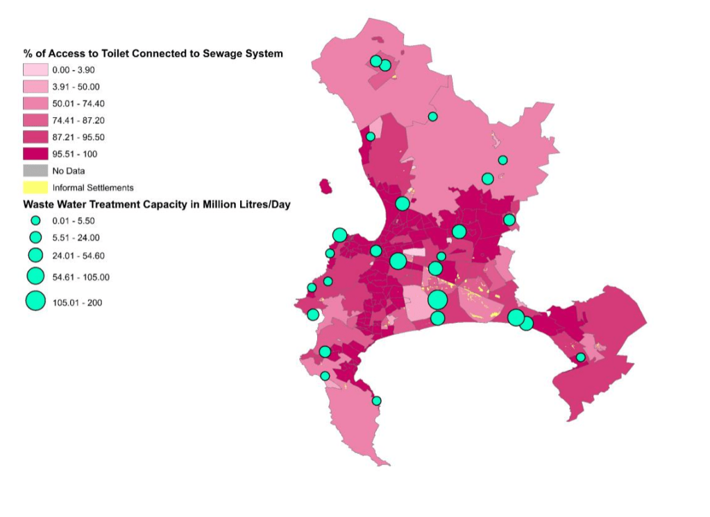 Unsurprisingly, yes. A recurring theme in my blogs has been the unevenly distributed (or lack of) infrastructures of social and ecological services in Cape Town. Sanitation represents yet another segment of the city’s metabolism that Townships have been disconnected from in yet another act of environmental racism. Figure 1 visualises this isolation, with informal settlements predominantly residing in regions unsupported by the municipalities sewage system. Sanitary negligence has led to a hotbed of disease, including dysentery, cholera and diarrhoea. The injustice is three-fold: sanitation is a basic human right, access is racially bound and the diseases are preventable.